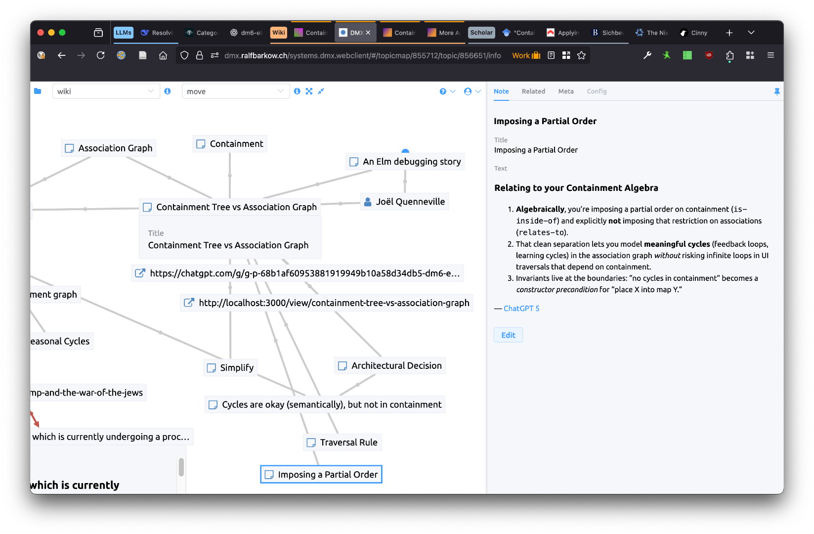 Algebraically, we’re imposing a partial order on containment (is-inside-of) and explicitly not imposing that restriction on associations (relates-to). That clean separation lets you model meaningful cycles (feedback loops, learning cycles) in the association graph without risking infinite loops in UI traversals that depend on containment. Invariants live at the boundaries: “no cycles in containment” becomes a constructor precondition for “place X into map Y.