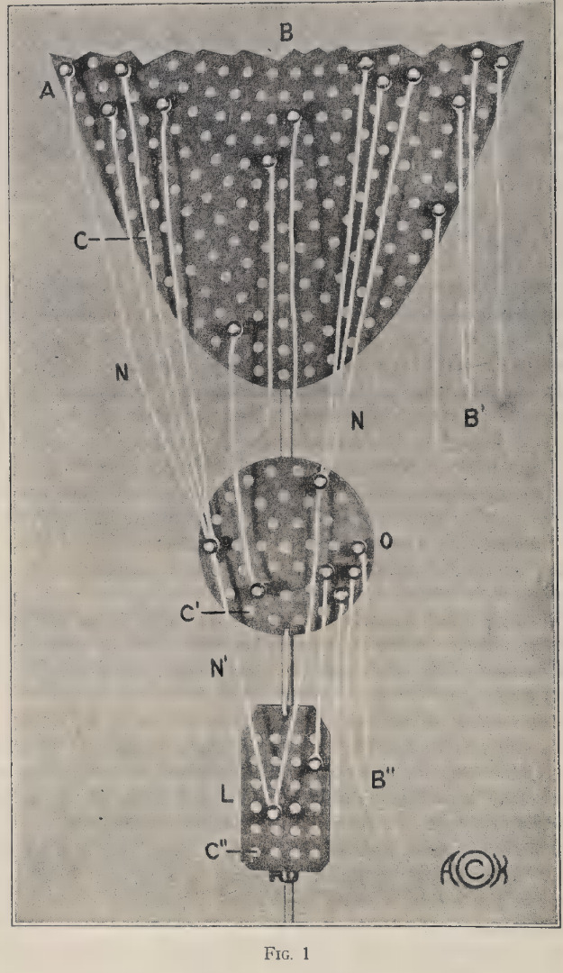 > In our diagram, Fig. 1, we indicate this by a parabola (A), which is supposed to extend indefinitely, which extension we indicate by a broken off line (B). We symbolize the characteristics by small circles (C), the number of which is obviously indefinitely great.