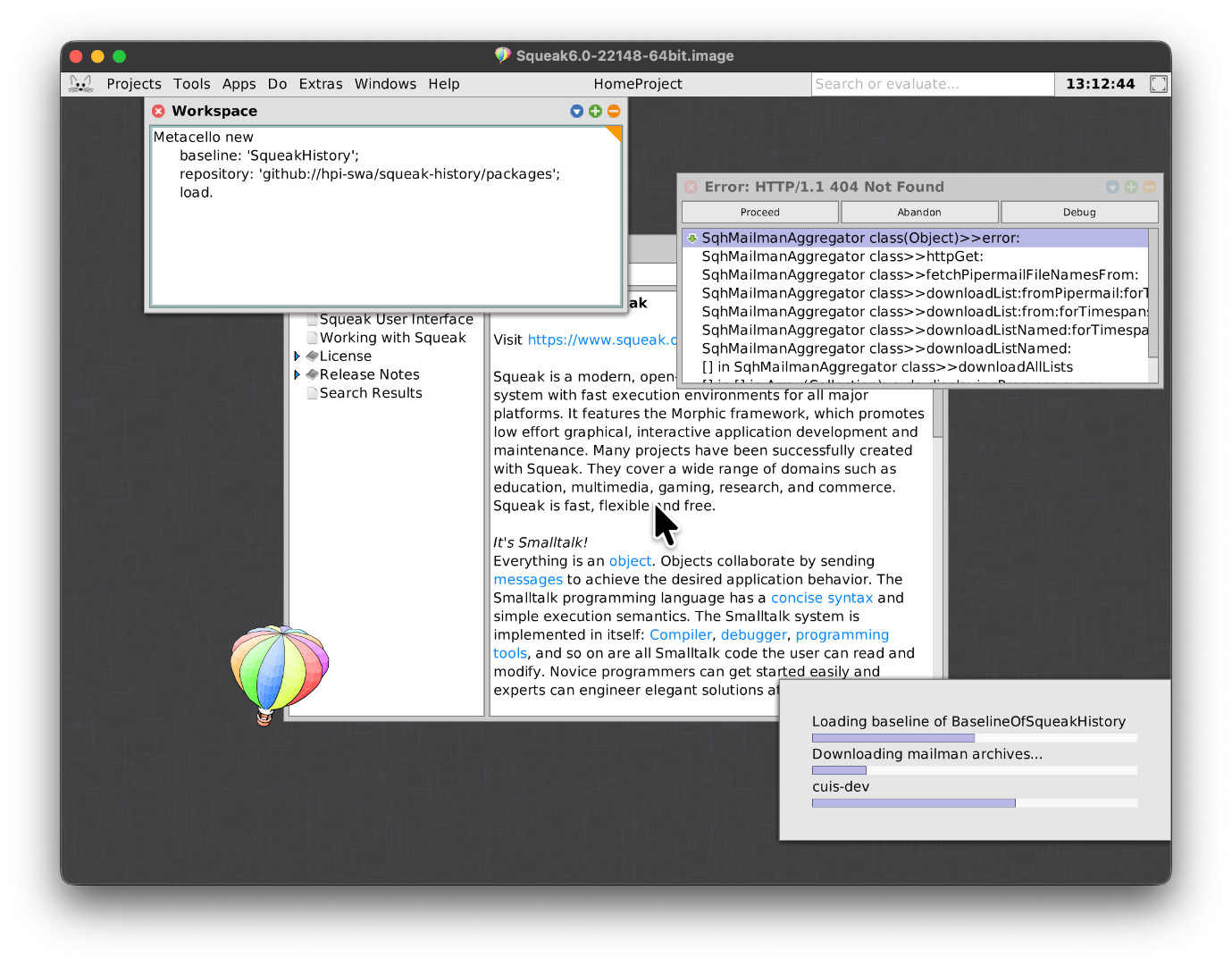 After the code was loaded, mailing list archives will be downloaded. See BaselineOfSqueakHistory >> #loadData for details.